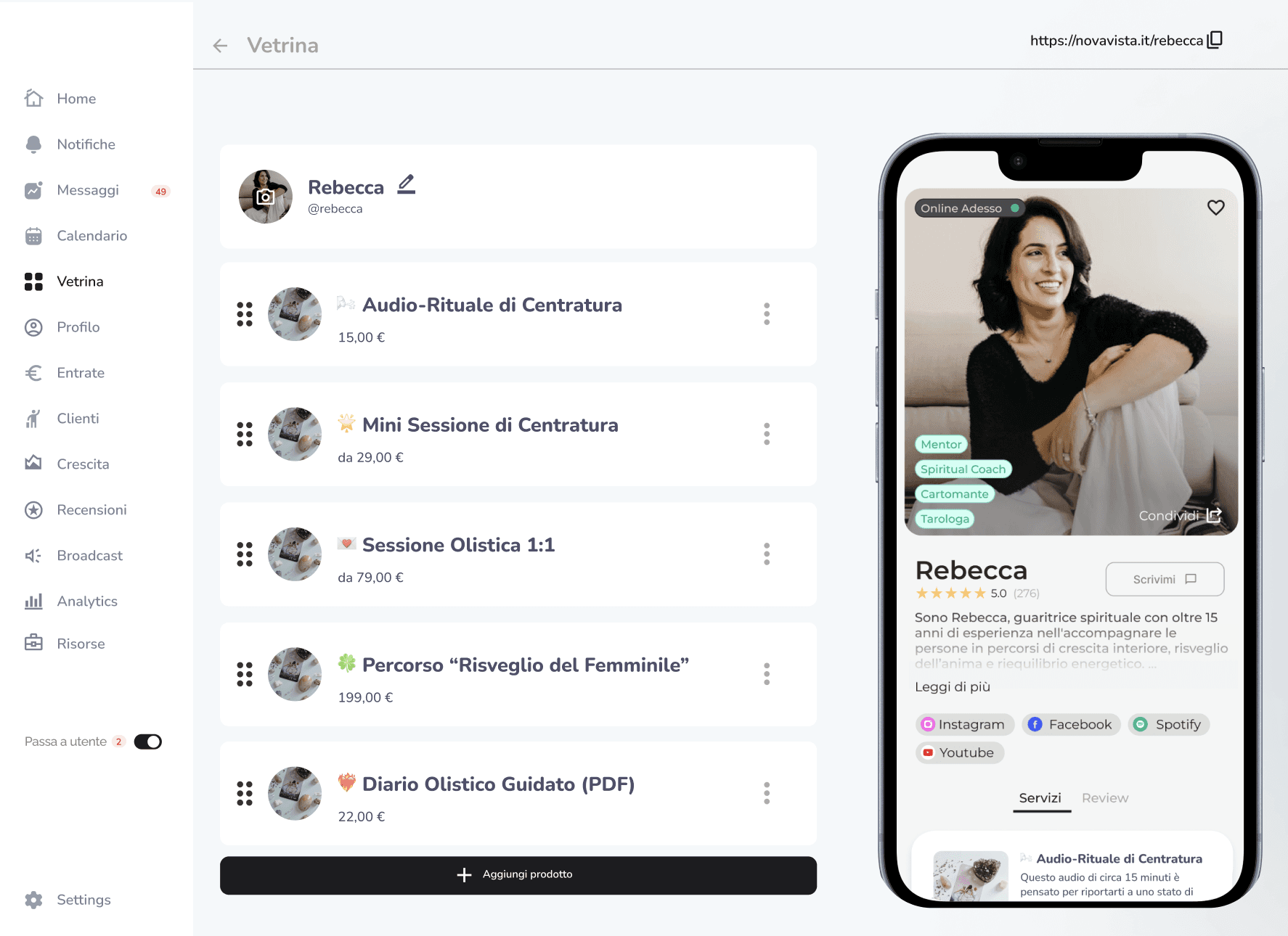 NovaVista è più di una semplice vetrina: è un sistema di crescita. Automatizza chat, pagamenti, follow-up, recensioni, gestione clienti e ti fornisce analisi avanzate per crescere ogni mese.
